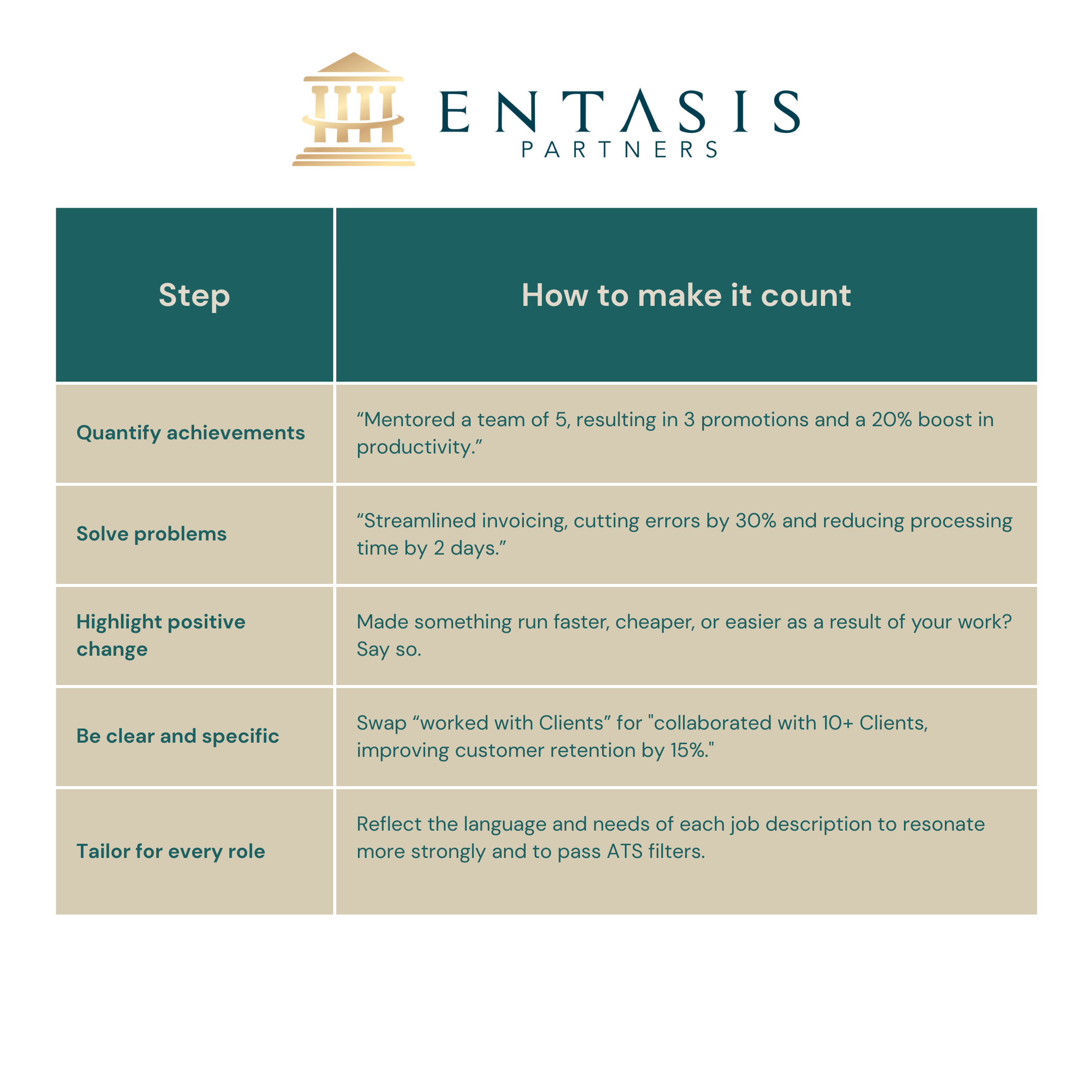 Whether you’re applying as a graduate, a mid-level specialist, or stepping into leadership - results resonate. Small wins like “exceeded weekly targets by 15%” or “improved team efficiency through documentation” can be powerful difference makers.